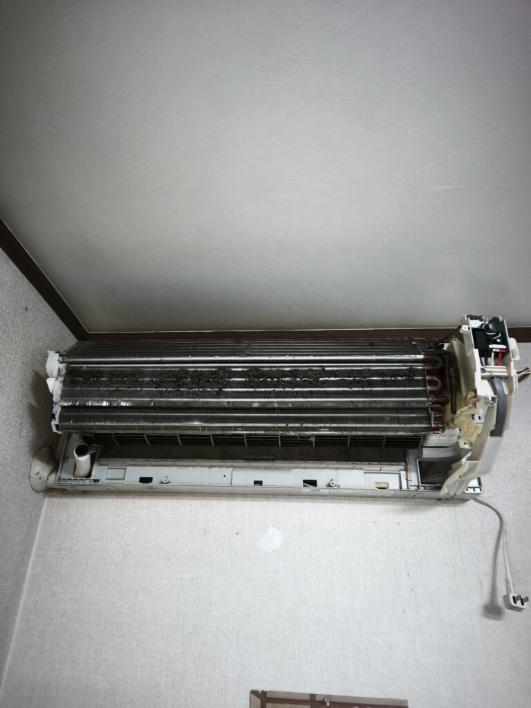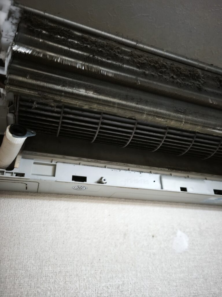 カバーを開けた瞬間、熱交換器(フィン)とファンに大量のホコリとカビが蓄積しているのが確認できました。