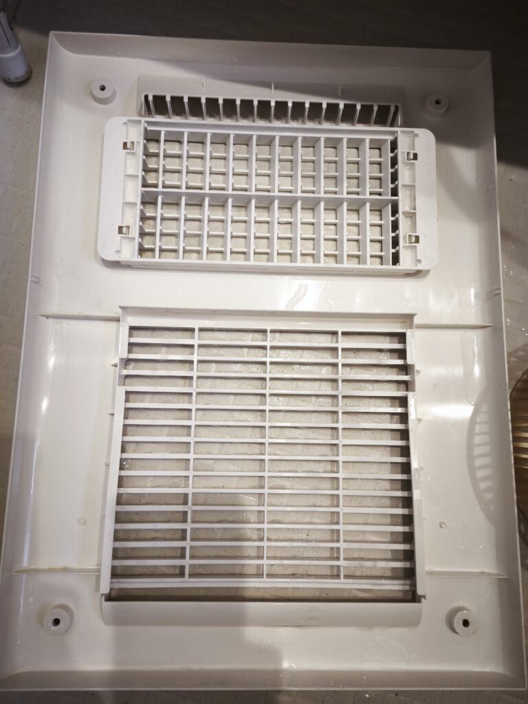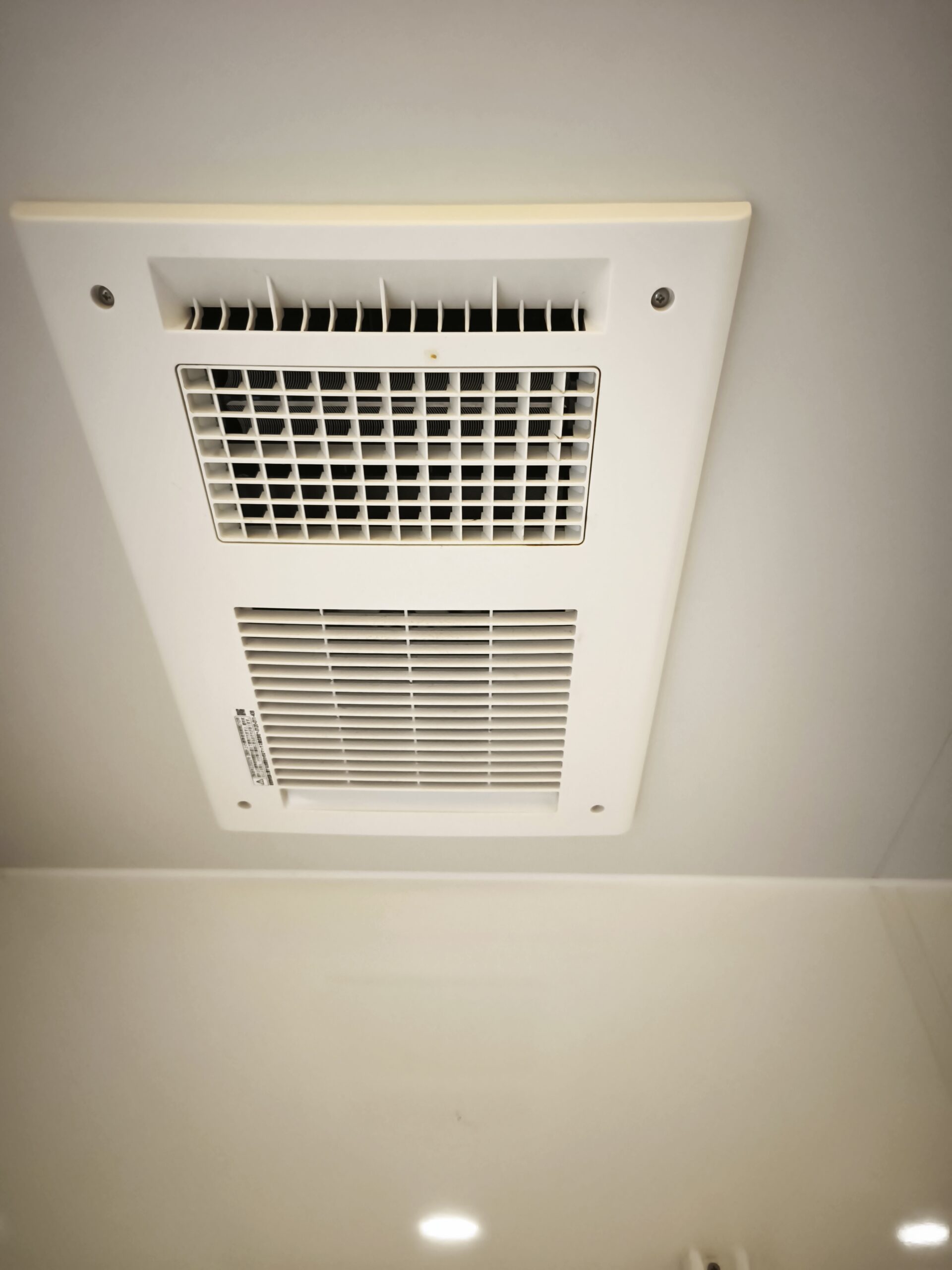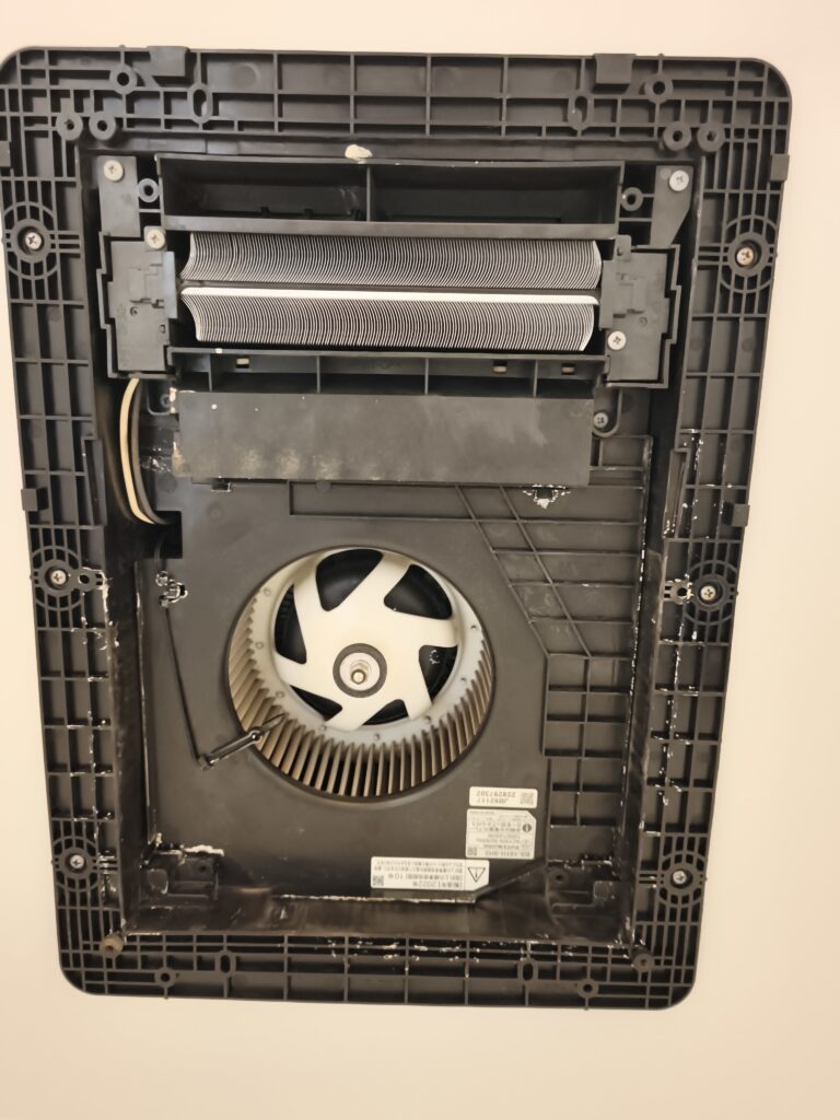 浴室の天井に埋め込まれたこのタイプの機器は、外から見るとグリルが白くきれいに見えることが多いです。ところが内部を開けてみると話は変わります。